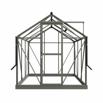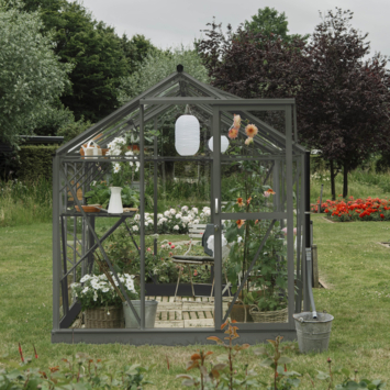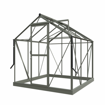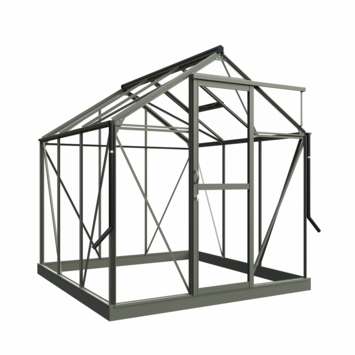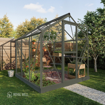 De Royal Well Mary I kweekkas in groengrijs voegt zowel stijl als functionaliteit toe aan je tuin. Met een binnenoppervlakte van 4,54 m² heb je genoeg ruimte om allerlei planten te kweken. Het veiligheidsglas van 3 mm biedt uitstekende bescherming tegen weersinvloeden, terwijl de stevige aluminium constructie zorgt voor duurzaamheid. Het zadeldak en de schuifdeur met haakslot zorgen voor een stijlvolle en praktische oplossing voor je tuin. De kas heeft een nokhoogte van 241 cm, zodat je comfortabel kunt werken. Het Full Options pakket bevat alles wat je nodig hebt, zoals een geïntegreerd schap, een tafel, pothouders en een automatische raamopener. De Royal Well Mary I is daarmee de ideale kweekkas voor elke tuinier.