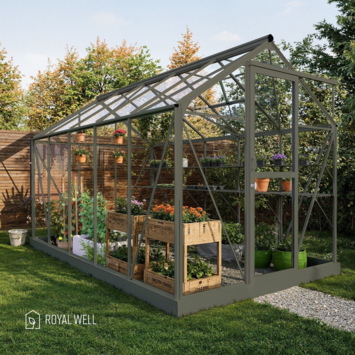 Met de Royal Well Mary III in groengrijs haal je een echte eyecatcher in je tuin. Deze kweekkas is niet alleen een plek om je planten te laten groeien, maar ook een fijne ruimte om even te relaxen. Het ontwerp met het zadeldak en de schuifdeur maakt het zowel praktisch als stijlvol. Je krijgt bij deze kas een Full Options pakket, waardoor je meteen aan de slag kunt. Denk aan een geïntegreerd schap en handige containers voor je potgrond. De veiligheidsglazen wanden zorgen ervoor dat je planten beschermd zijn tegen de elementen, en met een oppervlakte van 7,46 m² heb je meer dan genoeg ruimte om alles te kweken wat je maar wilt. En wist je dat je met de automatische raamopener altijd voor een perfecte ventilatie zorgt? Dit is de ideale kweekplek voor de enthousiaste tuinier!
