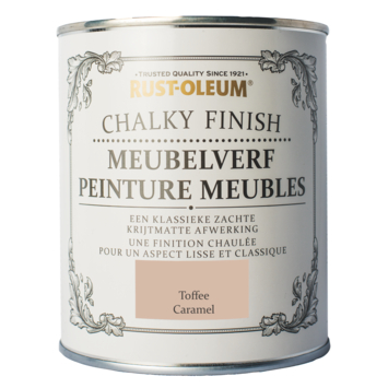 Rust-Oleum Meubelverf Toffee 750 ml is perfect om meubels een nieuwe uitstraling te geven. De verf mag rechtstreeks op hout (blank of geverfd), baksteen, tegel, pleister of elk ander voorbehandeld hard oppervlak worden aangebracht. Creëer een vintage look door twee lagen in contrasterende kleuren aan te brengen en deze zacht op te schuren wanneer de verf droog is. Werk voor het ultieme resultaat de Rust-Oleum Meubelverf Toffee 750 ml af met een beschermende laag Rust-Oleum Meubelwas of Rust-Oleum Meubelvernis mat.