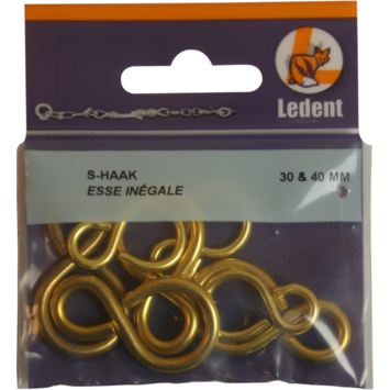 S-haken worden gebruikt om lichte voorwerpen mee op te hangen of om te verbinden. De S-haken 40 mm + 30 mm 6 stuks zijn gemaakt van metaal en hebben een aantrekkelijke messing kleur. Je kunt ze bijvoorbeeld makkelijk gebruiken in de keuken om keukengerei aan op te hangen. Wil je zware objecten ophangen? Kies dan voor een D-sluiting. Dit artikel wordt per 6 stuks geleverd en bevat twee maten, namelijk: 40mm en 30mm (3 stuks van iedere maat). Kortom: een stevige haak om lichte dingen aan op te hangen.