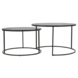 Afmetingen van de tafels: 46,5 cm hoog met een diameter van 75 cm en 39,5 cm hoog met een diameter van 65 cm.