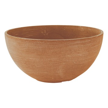 Deze ronde terrakleurige schaal (35x17 cm) is vervaardigd uit cement en heeft een gladde afwerking. Dit geeft de buitenpot een stoer en toch verfijnd uiterlijk. De buitenpot is handgemaakt en weersbestendig, dit maakt deze pot zeer geschikt voor tuin en terras.