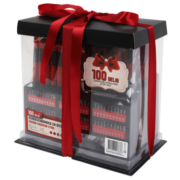 100 delige schroevendraaier- en bitset. Zeer compleet door de verschillende soorten vormen koppen en bitjes. Bevat onder andere de volgende vormen: plat, kruiskop, PH, PZ, Torx, vierkant en zeskant (inbus).