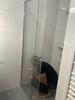 Er zou ook vanuit de fabriek een matte band horizontaal op de glasplaat mogen op zichthoogte, zodat je niet per ongeluk tegen de dichte deur loopt.