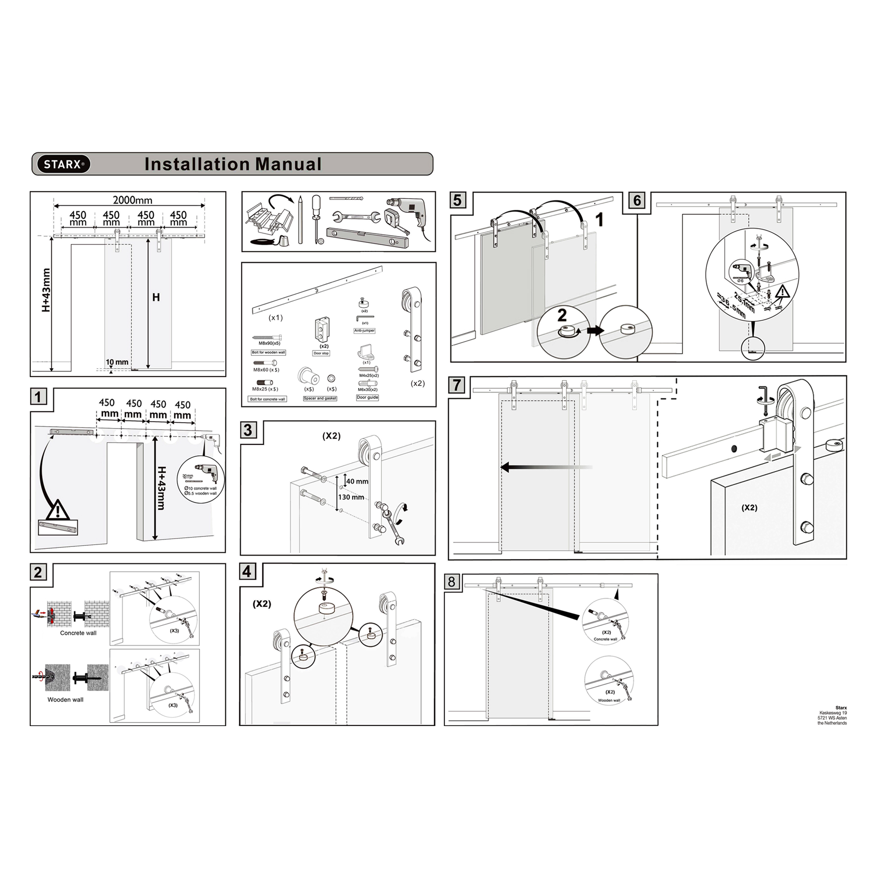 Met deze complete set voor een schuifdeursysteem maak je eenvouidig van een standaard deur een schuifdeur. Deze set is geschikt voor alle deuren met een gewicht van maximaal 150 kg en een dikte van maximaal 4 cm. De set heeft 2 koppelbare rails van 100 cm zodat de totale lengte van de rail 2 meter is. Gebruik je een standaard (binnendeur) van bijvoorbeeld 83 cm breedte dan kan de deur dus volledig open. De set wordt geleverd inclusief 2 gelagerde stalen hangrollen, 2 stalen deurstoppers, afstandshouders voor op de deur en de vloergeleider.