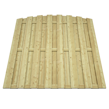 Deze variant heeft een elegante toogafwerking, waardoor de bovenkant mooi rond loopt. De afmetingen van de schutting zijn 180 x 180 cm, en de planken zijn 13,5 cm breed en 1,3 cm dik. Met een gemiddelde privacygraad, dankzij de plankmaat, het aantal planken en de mate van overlap, biedt deze schutting een goede balans tussen openheid en beschutting.