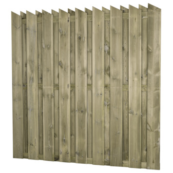 De schutting Royal is een houten schutting welke met een punt op elke plank is afgewerkt. Het tuinscherm is gemaakt van grenenhout. Dit soort hout is zeer geschikt voor het gebruik in de tuin. Daarnaast is het door het impregneren van het hout ook nog eens duurzaam. De schutting is gemaakt van 17 geschaafde planken van 15mm dik en 14cm breed. De afmetingen van het tuinscherm zijn 180x180cm en de planken zijn bevestigd met RVS schroeven. Deze gaan niet roesten en hierdoor kan de schutting jarenlang meegaan. Dus met de schutting Royal recht 180x180cm heb je een duurzame houten schutting waar je de komende jaren veel plezier van zal hebben.