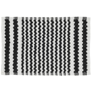 Met de antislip werking van de Sealskin Badmat Motif 50x80 cm Zwart glijd je niet meer uit op de badkamervloer. De badmat van 50 bij 80 cm is gemaakt van 100% katoen en neemt daardoor goed vocht op. Je kunt de mat in de wasmachine wassen op 30°C en drogen in de wasdroger. De mat is geweven met dikke losse draden, wat een comfortabel gevoel geeft aan je voeten. Het speels gegolfde patroon in zwart-wit geeft je badkamer een frisse uitstraling.