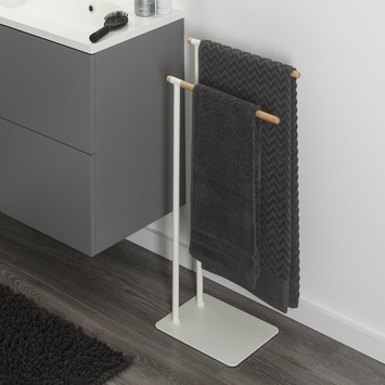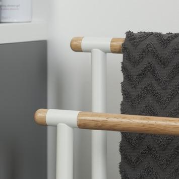 Het Sealskin handdoekrek Brix metaal wit is de ideale oplossing voor het ophangen van handdoeken in je badkamer. Dit biedt je de vrijheid om het rek te plaatsen waar jij het wilt, of dat nu naast de wastafel of in de douchehoek is. De combinatie van het strakke witte metaal en de elegante houten accenten zorgt voor een moderne en stijlvolle uitstraling die in elk interieur tot zijn recht komt. Dankzij de dubbele standaard kun je eenvoudig twee handdoeken ophangen, zodat je altijd een droge handdoek binnen handbereik hebt. Het onderhoud is eenvoudig; een snelle afveegbeurt met een vochtige doek is voldoende om het rek in topconditie te houden. Geniet van het gemak en de stijl die dit handdoekrek toevoegt aan jouw badkamer!