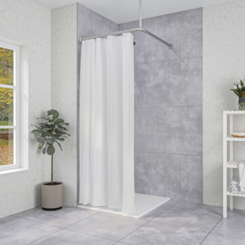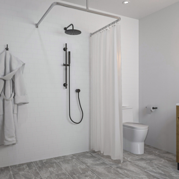 Sealskin Douchegordijnstang Easy Roll Aluminium 90x90 cm is een handig alles in één pakket voor het ophangen van een douchegordijn. Het pakket bestaat uit u-vormige douchestangen met een ingebouwde rails voor de twaalf meegeleverde haakjes en een plafondsteun. De plafondsteun heeft een open stukje waardoor de haakjes met het douchegordijn ongehinderd helemaal van links naar rechts en andersom door de rails geschoven kunnen worden. De stang kan gemonteerd worden rondom een bad van 80x170 of een douche 90x90x90.
