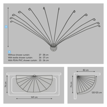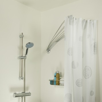 Sealskin Douchegordijnstang Umbrella Aluminium is een bijzonder ophangsysteem van Sealskin voor een douchegordijn waarbij geen gebruik gemaakt wordt van een douchestang maar van een speciale stalen constructie met 12 chroomen armen die boven de douche of het douchepaneel hangt. De houder van de armen is gemaakt van PP. De Umbrella heeft maar één bevestigingspunt nodig en is geschikt voor een douchegordijn met een breedte van 180 cm en 12 ophang oogjes.