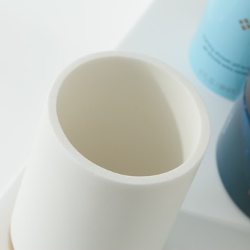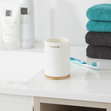 De Sealskin Beker Grace Wit is een stijlvolle toevoeging aan je badkamer. Deze beker, vervaardigd uit steen met een elegante afwerking in wit, biedt niet alleen een luxe uitstraling, maar is ook praktisch in gebruik. Dankzij de bamboe accenten krijgt het geheel een warmere uitstraling, wat bijdraagt aan een ontspannen sfeer. Eenvoudig te reinigen met een vochtige doek, blijft deze beker er altijd fris uitzien. Gebruik hem voor je tandenborstels of als houder voor andere badkameraccessoires. Maak je badkamer compleet met deze chique beker.