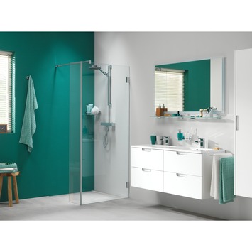 De volledig profielloze serie 'I AM' is met recht een transparante alleskunner. Naast diverse standaard maatvoeringen zijn talloze maatwerkoplossingen mogelijk. Zo kunnen we de breedte en hoogte aanpassen, maar bijvoorbeeld ook eventuele schuintes in de muren of het plafond opvangen. Deze A1 inloopdouche bestaat uit een wand met een vast deel op 90 graden. Het is een bijzonder transparante inloopdouche die nét even wat meer water in de doucheruimte houdt. Wat deze douche écht bijzonder maakt, is de stoere RVS uitstraling. Zo breng je een unieke sfeer in je badkamer. Het veiligheidsglas van maar liefst 8mm is altijd voorzien van een antikalk laag waardoor kalk en viezigheid zich minder snel zal hechten. I AM Inloopdouches van het type A1 zijn als beschikbaar in 900, 1000 en 1200mm. Het vaste deel is 300mm. Deze inloopdouche is tevens beschikbaar in een luxueuze zilver hoogglans afwerking en in een unieke matzwarte afwerking.