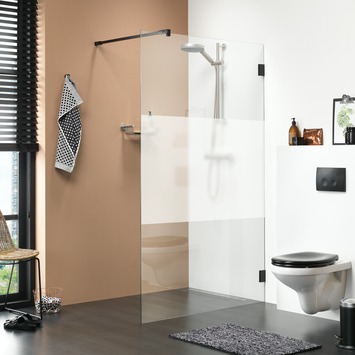 De volledig profielloze serie 'I AM' is met recht een transparante alleskunner. Naast diverse standaard maatvoeringen zijn talloze maatwerkoplossingen mogelijk. Zo kunnen we de breedte en hoogte aanpassen, maar bijvoorbeeld ook eventuele schuintes in de muren of het plafond opvangen. Deze Sealskin Inloopdouche I AM A3 88x200 cm Zwart met Gesatineerde Band (divider) is het toppunt van kwaliteit en transparantie. Daarnaast kun je de wand eenvoudig in een douchebak plaatsen of zelfs direct op de vloer monteren. Wat deze wand écht bijzonder maakt, is de matzwarte afwerking. Zo breng je een unieke sfeer in je badkamer. Het veiligheidsglas van maar liefst 8mm is altijd voorzien van een antikalk laag waardoor kalk en viezigheid zich minder snel hecht. Deze Walk in type A3 is tevens beschikbaar in de standaard maten 980, 1180,en 1380mm en natuurlijk in maatwerk. Daarnaast is deze inloop douche beschikbaar in een stoere RVS uitstraling en in een luxueuze zilver hoogglans afwerking.