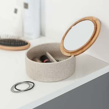 Het Sealskin spiegeldoosje is een stijlvol opbergbakje dat perfect is voor het organiseren van je kleine accessoires. Dankzij de spiegel in de deksel heb je altijd je essentials binnen handbereik en kun je je snel opfrissen. De deksel heeft twee slimme gleuven, zodat je de spiegel stevig kunt bevestigen en hij niet verschuift tijdens het gebruik. Het elegante ontwerp biedt niet alleen functionaliteit, maar voegt ook een vleugje luxe toe aan je badkamer of toiletruimte. Dit spiegeldoosje is ideaal voor het opbergen van make-up, sieraden of andere kleine items die je graag bij de hand houdt.