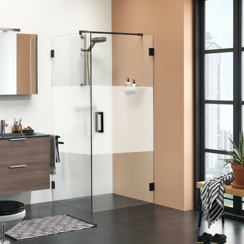 De volledig profielloze serie 'I AM' is met recht een transparante alleskunner. Naast diverse standaard maatvoeringen zijn talloze maatwerkoplossingen mogelijk. Zo kunnen we de breedte en hoogte aanpassen, maar bijvoorbeeld ook eventuele schuintes in de muren of het plafond opvangen. Deze Sealskin Swingdeur voor Douchewand I AM R 100x200 cm Zwart met Gesatineerde Band, voor combinatie met een vaste wand, wordt geleverd inclusief scharnieren en deurgreep. Dit artikel is de rechts te monteren variant, de links te monteren variant is ook in de GAMMA webshop te koop. Dat is namelijk de: Sealskin Swingdeur voor Douchewand I AM L 100x200 cm Zwart met Gesatineerde Band. Wat deze deur écht bijzonder maakt, is de matzwarte afwerking. Zo breng je een unieke sfeer in je badkamer. Het veiligheidsglas van maar liefst 8mm is altijd voorzien van een antikalk laag waardoor kalk en viezigheid zich minder snel hecht. I AM draaideuren zijn ook beschikbaar in de standaardmaat 900mm en natuurlijk als maatwerk oplossing. Deze draaideur en de bijpassende zijwand zijn tevens beschikbaar in een stoere RVS uitstraling en in een luxueuze zilver hoogglans afwerking.