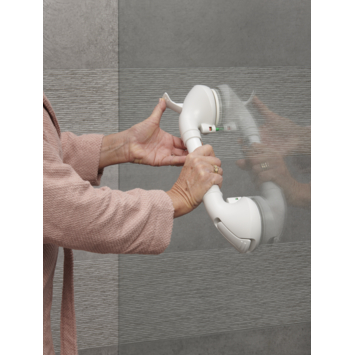 De Secucare wandbeugel 30cm heeft een uitstekende, blijvende zuigkracht door het grote zuignap oppervlak. Het grote voordeel is dat schroeven niet nodig zijn. De Secucare muurbeugel is ook zeer geschikt voor glazen douchewanden. De maximale belasting is 65 kg. De beugel wordt door middel van twee vergrendelingen muurvast op de gladde ondergrond vastgezet. De rood/groene visuele indicatoren geven aan of de wandbeugel goed vast zit en blíjft zitten. De greep is voorzien van een comfort grip voor extra houvast en is vervaardigd van corrosie bestendig metaal. De kappen zijn van slagvast ABS. Let op: de zuignappen moeten op een gladde, schone ondergrond geplaatst worden, dus niet op een structuur tegel of voeg.