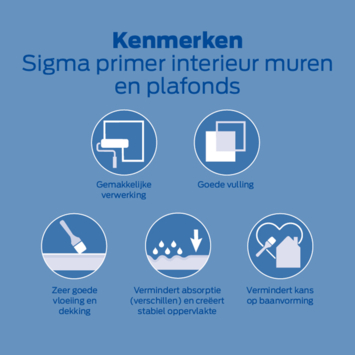 De Sigma Primer interieur voor muren en plafonds (grijs, 2,5 liter) is een matte primer die dient als perfecte basis voor je binnenschilderwerk. Deze primer vermindert de absoptie(verschillen) van de ondergrond en creëert daarmee een stabieler oppervlakte voor de eindafwerking en dus een professioneel eindresultaat. De primer is zeer goed dekkend, waardoor veelal met één afwerklaag kan worden volstaan. Sigma Primer Interieur laat zich prima verwerken met een ronde kwast of viltroller.