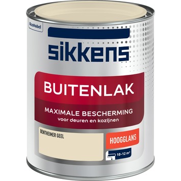 Sikkens buitenlak bentheimer geel hoogglans 750 ml is een hoogglans aflak op basis van alkydhars die u voor buiten kunt gebruiken. U kunt het met de kwast of met de roller aanbrengen op onder andere deuren en kozijnen. Sikkens Buitenlak Hoogglans is geschikt voor het afl akken van hout, staal, non-ferro metalen en diverse kunststoffen mits u ze voorziet van de juiste grondverf. Voor een perfect resultaat op uw houtwerk gebruikt u eerst Sikkens Grondlak.