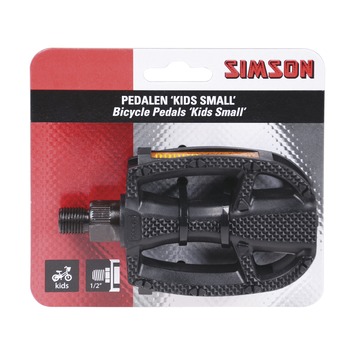 De Simson Kids Mini fietspedalen zijn ideaal voor iedere kinderfiets. De kunststof lichtgewicht trappers bewegen soepel zodat een kind deze makkelijk in beweging krijgt. De kinderschoenen hebben optimale grip door de antislip laag op het pedaal. Het pedaal heeft aan beide zijden reflectoren voor goede zichtbaarheid. Voorzien van 1/2 draad en uitgevoerd met kogellagers. Makkelijk te monteren door middel van een pedaalsleutel.