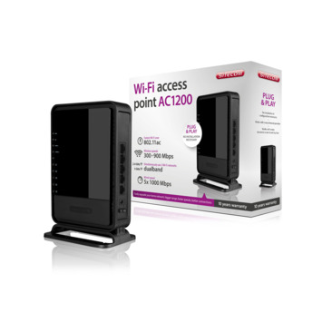 Het WLX-7000 AC1200 Wi-Fi Dual-band Access Point is plug-and-play als hij uit de doos komt. Gebruik simpelweg de meegeleverde netwerkkabel om het access point op een vrije poort van uw (modem)router of settopbox aan te sluiten. Er is geen installatie of configuratie nodig. Het toegangspunt is beveiligd met een vooraf ingesteld uniek Wi-Fi-wachtwoord (WPA2) en is aan de hand van de unieke Wi-Fi-naam (SSID) makkelijk terug te vinden in een lijst met Wi-Fi-netwerken.