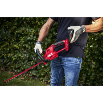 De „20V Max” (18 V) SKIL 0438 is een accuheggenschaar voor het snoeien van heggen en struiken. Deze maakt deel uit van het SKIL borstelloze programma en biedt ongeëvenaard waar voor zijn geld. Onze borstelloze motor is sneller, krachtiger en gaat 10 keer langer mee dan een gebruikelijke motor met koolborstels. Met het lasergesneden, diamantgeslepen mes van 45 cm biedt deze heggenschaar een uitstekende snoeikwaliteit. Het snoeien van dikke takken is geen probleem met de mesafstand van 20 mm en wordt gewaarborgd door de dubbelwerkende messen van gehard staal. U kunt zelfs langs muren of dichtbij de grond snoeien, dankzij de mespuntbeschermer. Dit voorkomt beschadiging van de mespunt, wanneer de accuheggenschaar een hard oppervlak raakt. Dankzij het exclusieve EASY STORAGE-ontwerp van SKIL neemt dit gereedschap na gebruik bijna geen ruimte in beslag. SKIL 0438 CA wordt geleverd met een mesbeschermer en een EASY STORAGE-haak. De accu en oplader zijn niet inbegrepen.
