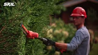 De „20V Max” (18V) SKIL 0640 is een telescopische accuheggenschaar voor het zonder ladder trimmen van hoge, moeilijk bereikbare takken en struiken. Deze heggenschaar heeft een mes van 45 cm met een tandafstand van 18 mm om takken door te snijden. De draaibare snijkop met 8 posities maakt veelzijdig trimmen mogelijk. De 0640 wordt geleverd met een verlengsteel die het gereedschap naar een volledige lengte van 3 meter verlengt en kan worden verwijderd voor compact opbergen na gebruik. De mespuntbeschermer voorkomt beschadiging van het mes, wanneer dit in aanraking komt met een muur of hek. Bovendien is deze heggenschaar op steel uitgerust met het SKIL „Easy Storage”-ontwerp voor netjes opbergen van uw tuingereedschap. De SKIL 0640 CA wordt geleverd met een verlengsteel, mesbeschermer, schouderriem, „Easy Storage”-haak en „U link”. De accu en lader voor dit apparaat moeten apart besteld worden.