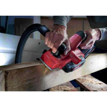 De schaafmachine is voorzien van omkeerbare TCT-schaafmessen voor een langere levensduur. Wanneer één kant versleten is, kunnen de messen eenvoudig worden omgedraaid om verder te werken. De spaanafvoer kan worden aangepast door de hendel te wisselen van links naar rechts. Voor een schonere werkomgeving kan een stofzak of een standaard stofzuiger aan beide kanten van de schaafmachine worden aangesloten.