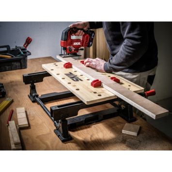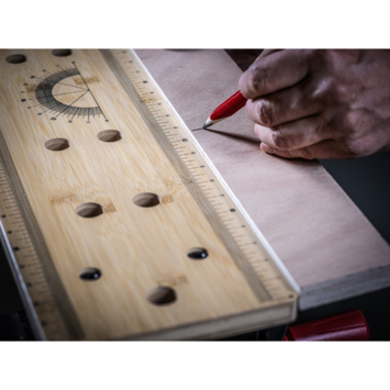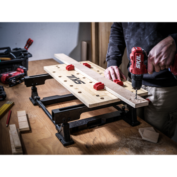 SKIL 1290 is een compacte en stevige werkbank die ontworpen is voor flexibiliteit en gemak bij het vervoer. Naast het feit dat deze op de grond of verhoogd op een tafel kan worden gebruikt, kan deze veelzijdige werkbank op een inklapbaar onderstel van SKIL (niet meegeleverd, onderdeelnummer BT1E1301AA) of een mobiel opbergsysteem van SKIL (niet meegeleverd, onderdeelnummer 2610S01671) worden gemonteerd; verbinding bij allebei zonder gereedschap. Uitgerust met klembekken van bamboe biedt de werkbank een betere waterbestendigheid om duurzaamheid te waarborgen. Met de dubbele slingers van de werkbank kunt u asymmetrisch gevormde voorwerpen stevig vastklemmen. En de meegeleverde vier verstelbare draaipennen zijn ideaal om onregelmatig gevormde of bredere voorwerpen vast te klemmen. Door de geïntegreerde V-groeven kunnen ronde vormen, zoals metalen of kunststof buizen worden vastgeklemd. Voor nog meer gemak maken linialen snelle metingen tijdens de klus mogelijk. SKIL 1290 AA wordt geleverd met 4 pennen.