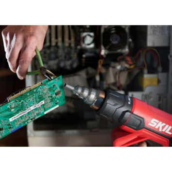 De SKIL 8040 is een krachtig 2000W heteluchtpistool en is ideaal voor een groot aantal klussen zoals het verwijderen van verf en stickers en het aanbrengen en verwijderen van wax op ski's en nog veel meer. Dit heteluchtpistool wordt elektronisch geregeld, wat betekent dat de elektronica continu het temperatuurniveau van het gereedschap bewaakt en zo voorkomt dat het oververhit raakt. Hierdoor kunt u mondstukken met kleine diameters gebruiken voor diverse soldeer-, desoldeer- en lasklussen. Dit heteluchtpistool is compatibel met de meest gangbare, ruim op de markt verkrijgbare mondstukken voor heteluchtpistolen, zodat u altijd het juiste mondstuk voor uw klus kunt vinden. Met het handige LCD-display kunt u precies de juiste temperatuur en luchtstroom voor uw klus instellen. U kunt temperaturen instellen van 50 tot 650 °C en u kunt kiezen uit vijf luchtstroominstellingen van 250 en 500 l/min. Door de unieke uitwerpfunctie van de mondstukken kunnen ze altijd snel en veilig gewisseld worden, met name als ze heet zijn. Hierdoor hoeft geen enkele klus te wachten. De SKIL 8040 GA wordt geleverd in een draagkoffer met een reduceermondstuk, een reflectormondstuk, een 9-mm-reduceermondstuk en een plat mondstuk.