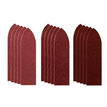 Deze set bestaat uit 15 flexibele vellen vingervormig schuurpapier met Velcro-systeem. De vellen hebben grove, medium en fijne korrelgroottes en zijn geschikt voor materiaalafname en gladde afwerking.