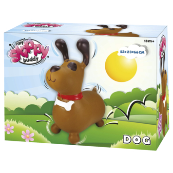 Superleuke skippy hond, om lekker op rond te huppen! De bruine hond heeft grappige oren en een rode halsband met een bot eraan. Deze opblaasbare hond werkt hetzelfde als een skippybal en zorgt voor eindeloos veel springplezier. Zorgt voor ontwikkeling van de motoriek, doordat jouw kind tegelijkertijd moet springen, vasthouden en het evenwicht moet bewaren. Hierdoor wordt de oog-handcoördinatie en het evenwichtsgevoel op een leuke manier getraind. Afmetingen: 52 x 23 x 66 cm. Wordt geleverd in full-colour doos. Geschikt voor kinderen vanaf 18 maanden.