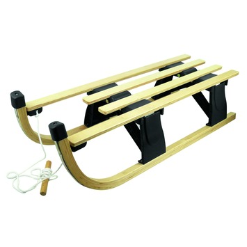 Stevige houten slee. Inklapbaar, dus makkelijk mee te nemen en op te bergen. De slee heeft een degelijk kunststof vouwsysteem en stalen glij-ijzers. Inclusief trekkoord met houten grip. Leeftijdscategorie: vanaf 5 jaar. Maximaal draagvermogen: 50 kg.