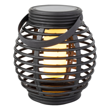 Deze zwarte gevlochten lantaarn geeft met zijn vorm je tuin een moderne uitstraling. Met het vlam-effect in de lantaarn is het meteen gezellig aan tafel in de donkere avonduurtjes. De lantaarn is voorzien van een LED lamp die warm wit licht zal geven. De lantaarn is oplaadbaar door zonne-energie en geeft tot wel 6 uur licht. De lantaarn is 16 cm hoog.