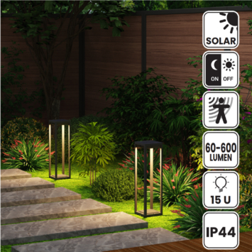 Tuinsokkel Foz is een solar lamp in zwart. De tuinsokkel is geschikt als sfeer- of oriëntatieverlichting voor buiten. Het moderne uitlijk van de tuinsokkel zorgt er voor dat hij in iedere tuin past. De geïntegreerde lamp werkt op zonne-energie. De tuinsokkel is op 3 standen instelbaar; 1. het licht is aan zodra het begint te schemeren, 2. het licht is aan bij schemering en zodra het een beweging detecteert verhoogd de lumen naar 240 voor 25 seconden, 3. het licht gaat voor 25 seconden zodra het een beweging detecteert. Plaats tuinsokkel Foz bij voorkeur op een zonnige plek, het aantal branduren is afhankelijk van het aantal uren dag- en zonlicht.