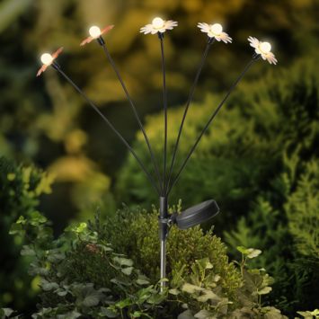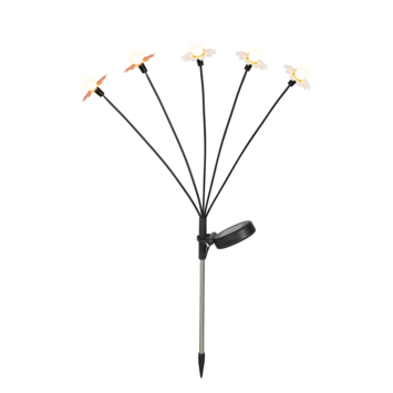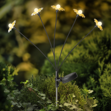 Deze Solar Tuinsteker met zonnebloemen heeft vijf vuurwerkvormige zonnebloemen en geeft een zacht warme gloed. Deze solar tuinsteker van siert balkons en terrassen. Elke zonnebloem is voorzien van warm wit LED-lampjes die tot 8 uur lang branden. Dankzij de meegeleverde oplaadbare batterij straalt deze lichtbron moeiteloos na zonsondergang..