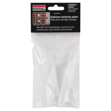 Deze zeefhuls gebruik je voor het Soudal Chemisch Anker. Wanneer je boort in niet massieve muren, zoals cellenbeton, gebruik je een zeefhuls om een goede verbinding te maken. Boor eerst je gaten uit, maak deze schoon met een staaborstel en stop de zeefhuls in het boorgat. Let op: doe het dopje van de zeefhuls er nog niet op. Eerst vul je de zeefhuls met het chemisch anker mengsel, waarna je het dopje erop doet. Vervolgens stop je de draadstang of bout in de zeefhuls en is je verbinding gemaakt. Na een half uurtje zal je draadstang nooit meer van de muur komen. Deze zeefhulzen zijn per drie stuks verpakt.