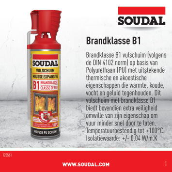 Een brandvertragend PU-schuim dat eenvoudig uit te spuiten is, dat is Soudal brandvertragende PU-schuim 500 ml. Dankzij het 'Genius Gun'-systeem heeft dit product een handig handvat waarmee je het PU-schuim eenvoudig kunt uitspuiten. Met het sluitsysteem is deze bus perfect af te sluiten, zodat je deze tot 6 weken na elk gebruik kunt gebruiken. Handig voor het brandvertragend opvullen en isoleren van onder andere kieren, gaten en voegen in verschillende bouwmaterialen en omlijstingen van deuren. Kortom: een PU-schuim dat bestand is tegen maximaal 100°C.