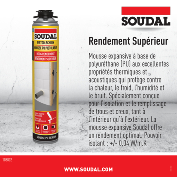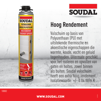 Voor het monteren en afdichten van deuren, ramen, panelen, golfplaten en dakpannen, gebruik je Soudal PU-schuim 750 ml voor schuimpistool. Bovendien is dit product geschikt voor het opvullen en isoleren van voegen, doorvoeren en holle ruimten. Dankzij de handige schroefdraad op dit product, koppel je hem eenvoudig op een PU pistoolschuim van Soudal. Kortom: een goed product voor precieze toepassingen.
