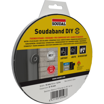Met Soudal Soudaband DIY BG1 compriband 15/8-15 dicht je eenvoudig bewegingsvoegen en aansluitingen in bouwtoepassingen. Deze voorgecomprimeerde voegdichtingsband heeft één kleefzijde, waardoor je hem makkelijk aanbrengt. Na plaatsing zet de voegband uit en vult hij de voeg volledig op, zodat je een betrouwbare afdichting krijgt.