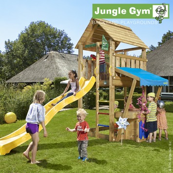 Dit klassieke speeltoestel met houten dak stimuleert veel leuke fantasierijke activiteiten, zoals een winkeltje, ijskraam, theater loket of een poppenkast voorstelling. Daarnaast zijn er nog allerlei andere speelmogelijkheden, zoals telescoop, kleurrijke klimladders aan de voor- en achterkant, lange glijbaan met optionele wateraansluiting, en zandbak.