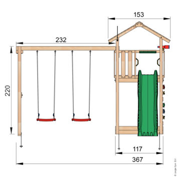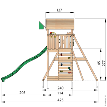 Bezorg je kinderen urenlang plezier in de buitenlucht met deze geweldige speelset. Het biedt twee schommelzitjes, een lange glijbaan, een zandbak, een klimwand met grote grepen, een trapje, een telescoop en een stuur. Dit speeltoestel is voor kinderen van 3-10 jaar en stimuleert hun verbeeldingskracht en gevoel voor avontuur. Jungle Gym heeft al 30 jaar passievolle ervaring in het ontwerpen en produceren van speeltoestellen in Nederland, met gegarandeerde kwaliteit en veiligheid. Onze producten voldoen aan de strengste Europese veiligheidsvoorschriften (EN 71) en de materialen zijn weerbestendig en volledig veilig voor kinderen, vrij van toxische stoffen en allergenen. Kies zorgeloos voor een geweldige ervaring van spelen voor uw kinderen en bied ze het beste speelplezier in hun eigen tuin!