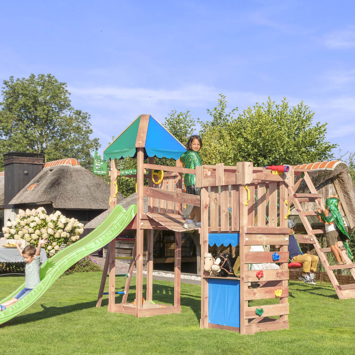 Speeltoestel Jungle Gym Explorer met groenen glijbaan en klimrek van douglashout