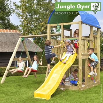Een rustiek speeltoestel met dubbele schommel voor gezellig samen schommelen, 2 platformhoogtes, koepelvormig tentdak, en extra veel speelmogelijkheden zoals een klimmuur met gekleurde klimstenen, periscoop kijker, glijbaan met optionele wateraansluiting en grote zandbak.