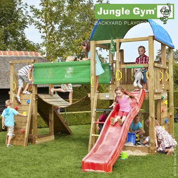 Een avontuurlijk speeltoestel met 2 platformhoogtes, koepelvormig tentdak, klimmuur met gekleurde klimstenen, periscoop kijker, glijbaan met optionele wateraansluiting, grote zandbak én een sterke houten loopbrug die leidt naar een tweede klimtorentje met uitdagingen aan beide kanten; een extra klimmuur met gekleurde klimstenen en een spannende ramp met klimtouw.