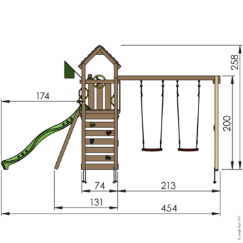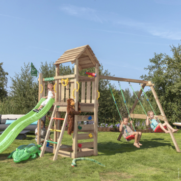 Speeltoestel Jungle Gym Safari met groene glijbaan en dubbele schommels van grenenhout