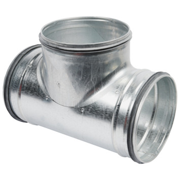 Spiraalbuis 90° T-stuk Ø150mm ten behoeve van gegalvaniseerde buis. Deze gegalvaniseerde koppelstukken hebben een rubber flens voor luchtdichtheidsklasse D volgens norm EN12237.