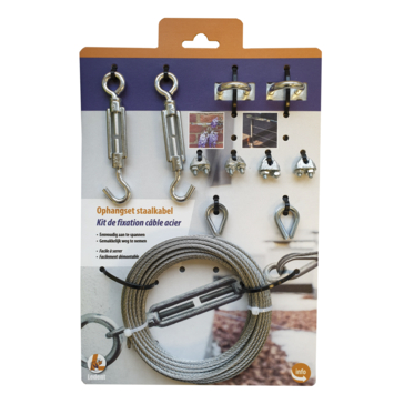 Set met staalkabel en de nodige bevestigingselementen, inclusief installatie stappenplan met foto's. De staalkabel heeft een grotere trekkracht dan touw en rekt of krimpt niet. Het is een robuust, slijtvast en stevig materiaal en dient om trekkrachten over te brengen. De staalkabel bestaat uit verschillende draden die in strengen gedraaid zijn en rond een kern liggen.