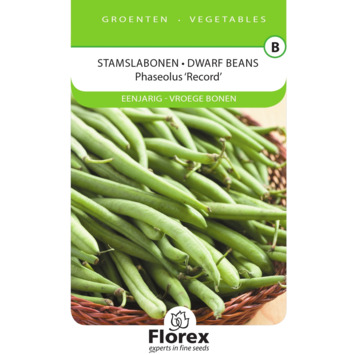 Stamslabonen (Phaseolus, Record) Vroege bonen. Vrij lange rijkdragende boon. De Stamslabonen Zaadjes bloeien in Mei, Juni, Juli. Dit is een Eenjarig plant Deze zaadjes kunnen gepland worden in Mei, Juni, Juli en ontkiemen in dagen.