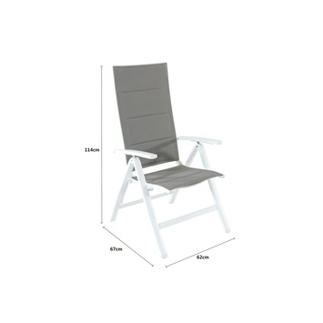 Op zoek naar een strak vormgegeven standenstoel voor in je tuin? Dan zit je met standenstoel Cannes de Luxe helemaal goed. Deze standenstoel is gemaakt van grijs textileen met een wit aluminium frame, wat deze stoel heel licht maakt en dus makkelijk te verplaatsen. Bovendien zijn beide materialen weerbestendig, dus je kunt de stoel altijd buiten laten staan. Het witte frame en de grijze kussens vormen een mooi en modern contrast en geeft de stoel een luxe uitstraling. De stoel is geheel naar eigen wens in 4 verschillende standen te stellen en dankzij de inklapbegeleiding makkelijk op te bergen. De Cannes de Luxe-serie bestaat verder nog uit loungestoelen, ligbedden of een complete loungeset. Zo behoud je dezelfde stijl in jouw gehele tuin. Kortom: deze standenstoel van het merk Wakefield is een stijlvolle toevoeging aan jouw tuin.